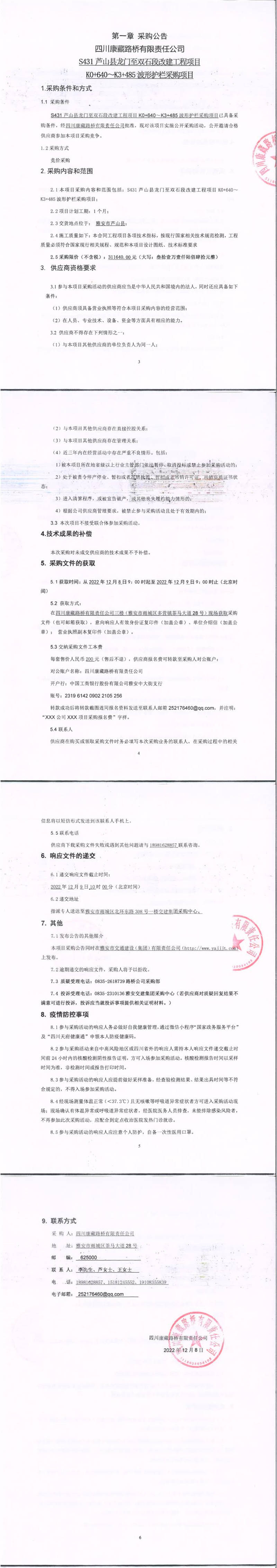 四川康藏路橋有限責(zé)任公司S431蘆山縣龍門鎮(zhèn)至雙石段改建工程項(xiàng)目K0+640-K3+485波形護(hù)欄采購(gòu)項(xiàng)目采購(gòu)公告