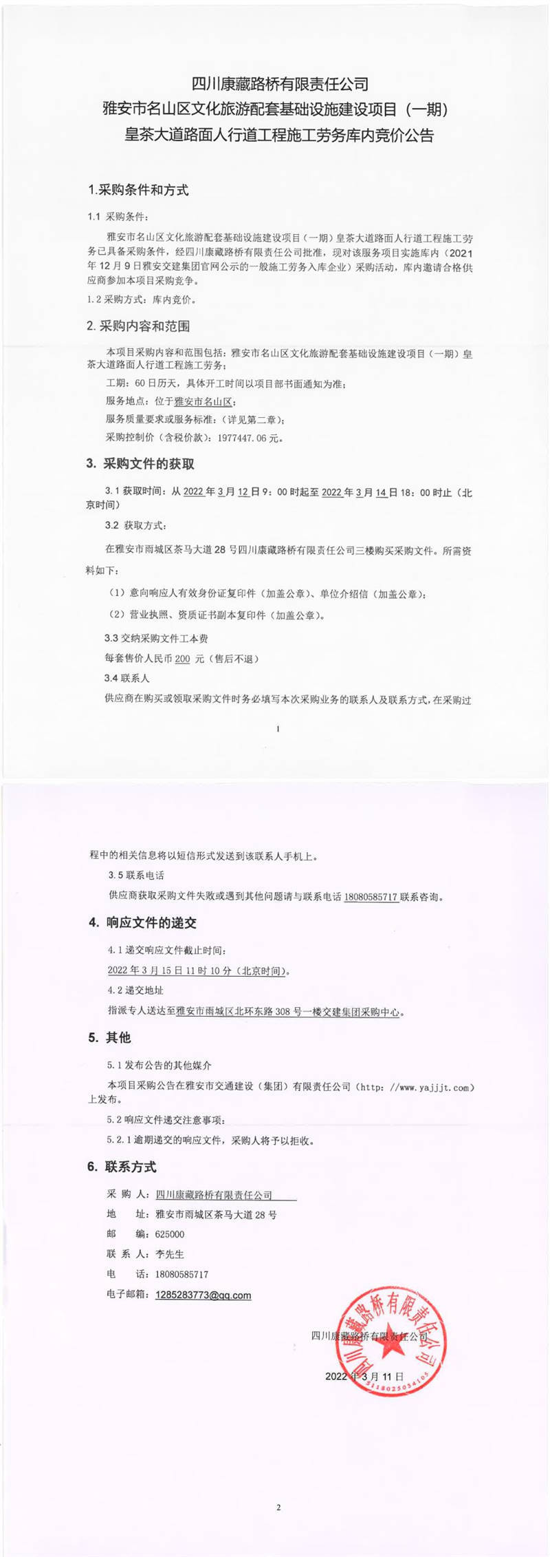 四川康藏路橋有限責(zé)任公司雅安市名山區(qū)文化旅游配套基礎(chǔ)設(shè)施建設(shè)項目(一期)皇茶大道路面人行道工程施工勞務(wù)庫內(nèi)競價公告