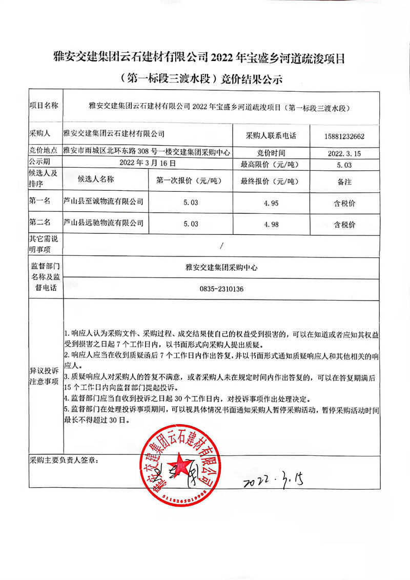 雅安交建集團(tuán)云石建材有限公司2022年寶盛鄉(xiāng)河道疏浚項(xiàng)目(第二標(biāo)段紙廠頭段)競價(jià)結(jié)果公示