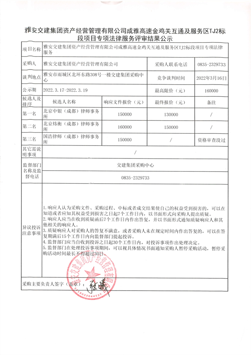 雅安交建集團資產經營管理有限公司成雅高速金雞關互通及服務區(qū)TJ2標段項目專項法律服務評審結果公示