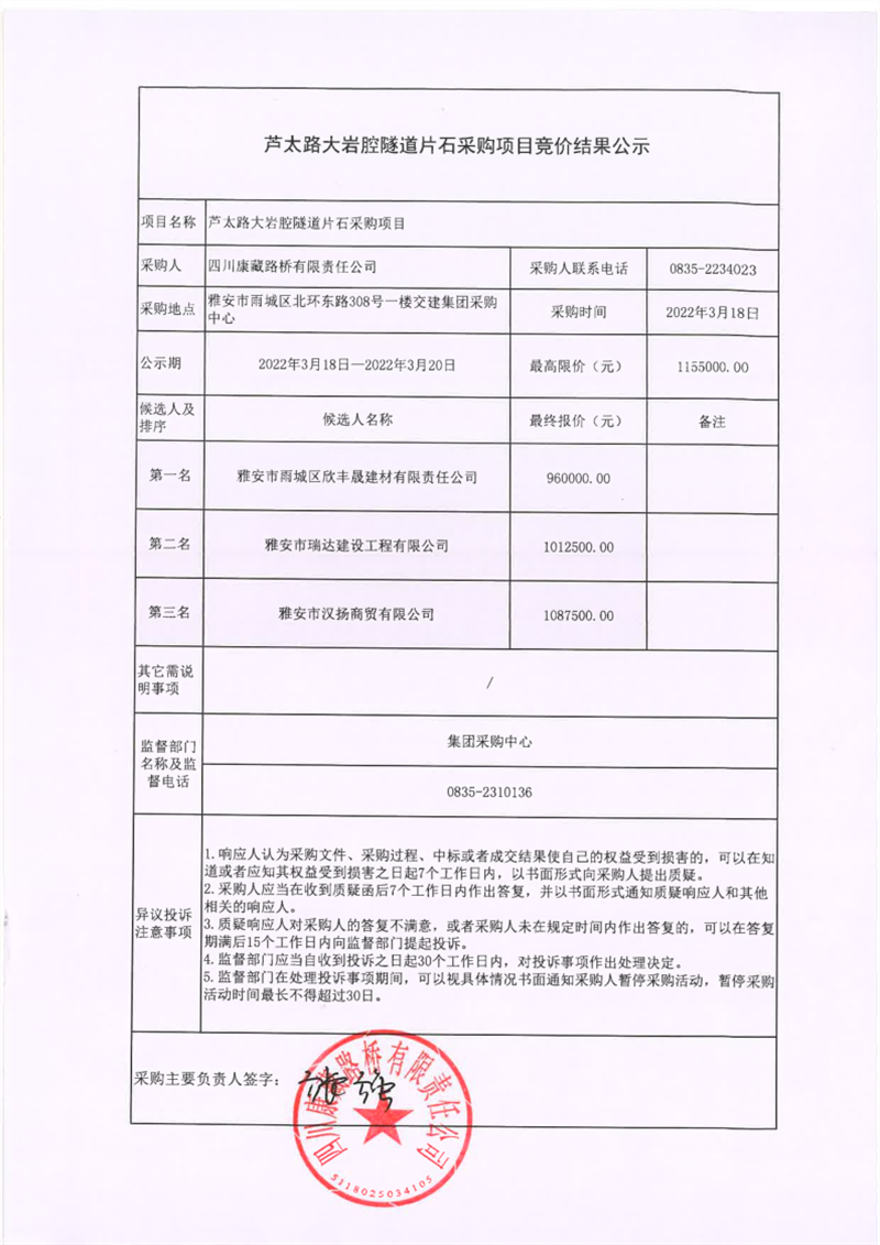 四川康藏路橋有限責(zé)任公司蘆太路大巖腔隧道片石采購項(xiàng)目競價結(jié)果公示