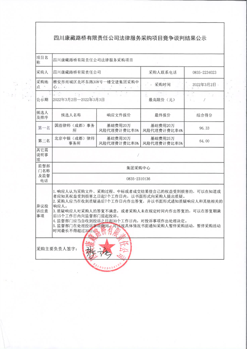 四川康藏路橋有限責(zé)任公司法律服務(wù)采購(gòu)項(xiàng)目競(jìng)爭(zhēng)談判結(jié)果公示