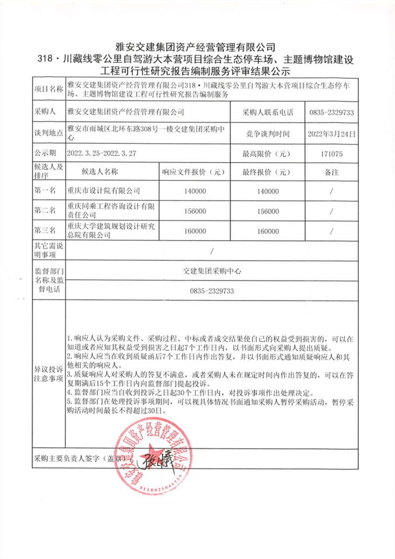 雅安交建集團(tuán)資產(chǎn)經(jīng)營(yíng)管理有限公司318.川藏線零公里自駕游大本營(yíng)項(xiàng)目綜合生態(tài)停車(chē)場(chǎng)、主題博物館建設(shè)工程可行性研究報(bào)告編制服務(wù)評(píng)審結(jié)果公示