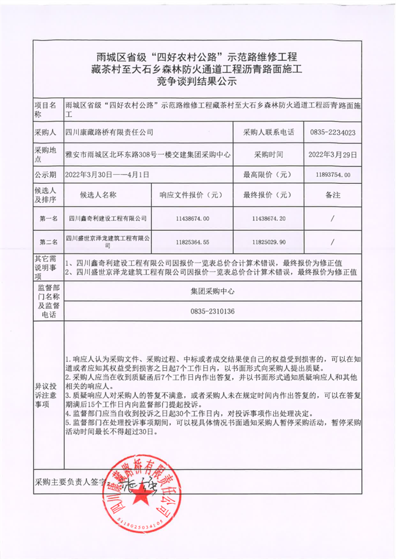 四川康藏路橋有限責(zé)任公司雨城區(qū)省級“四好農(nóng)村公路”示范路維修工程藏茶村至大石鄉(xiāng)森林防火通道工程瀝青路面施工競爭談判結(jié)果公示