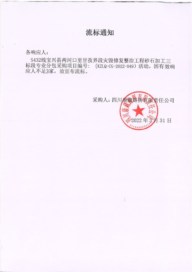 四川康藏路橋有限責任公司S432線寶興縣兩河口至甘孜界段災(zāi)毀修復整治工程砂石加工三標段專業(yè)分包采購項目流標通知
