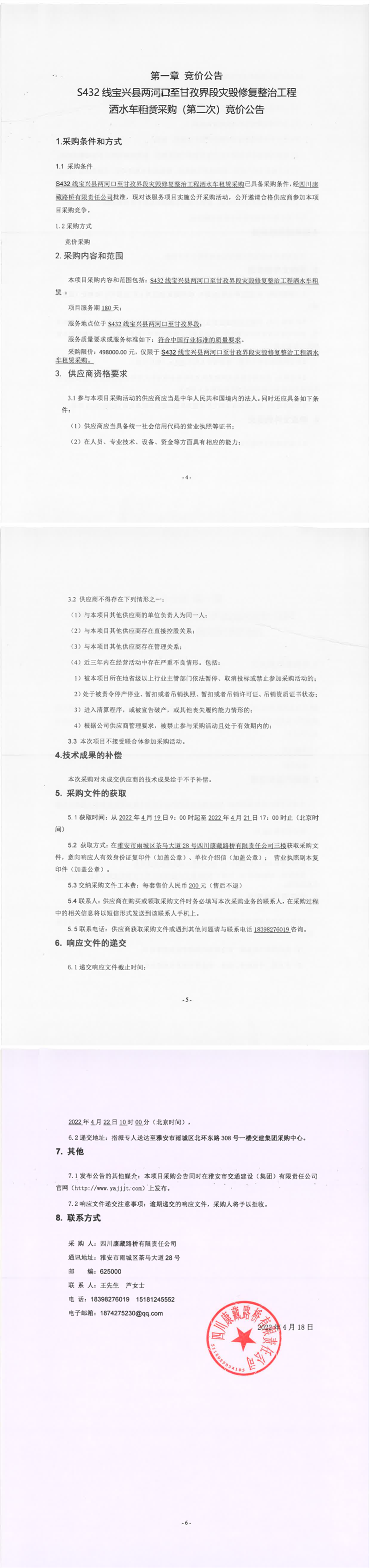 四川康藏路橋有限責(zé)任公司S432線寶興縣兩河口至甘孜界段災(zāi)毀修復(fù)整治工程灑水車租賃采購(第二次)競(jìng)價(jià)公告