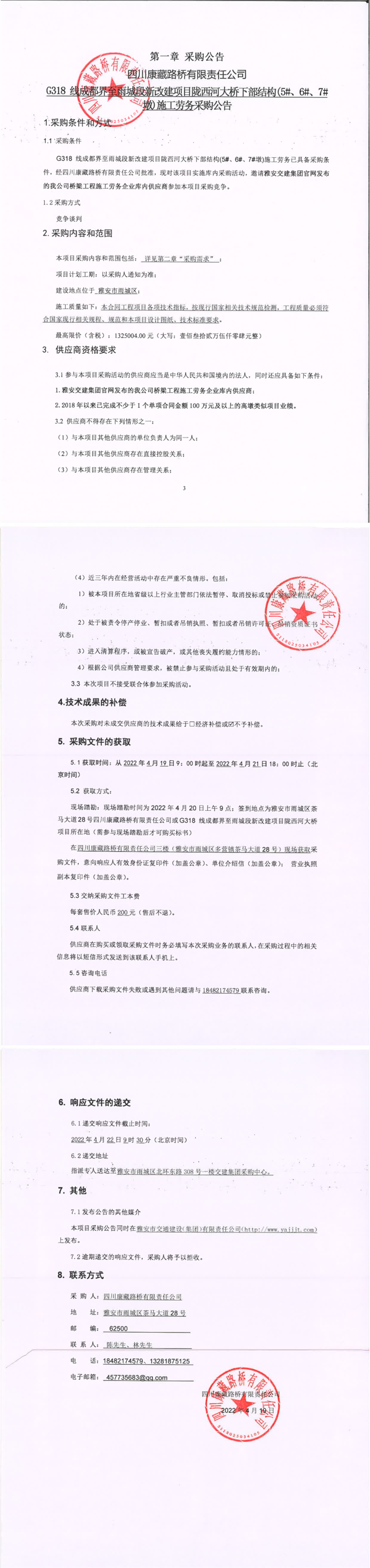四川康藏路橋有限責(zé)任公司G318線成都界至雨城段新改建項目隴西河大橋下部結(jié)構(gòu)(5#、6#、7#墩)施工勞務(wù)采購公告