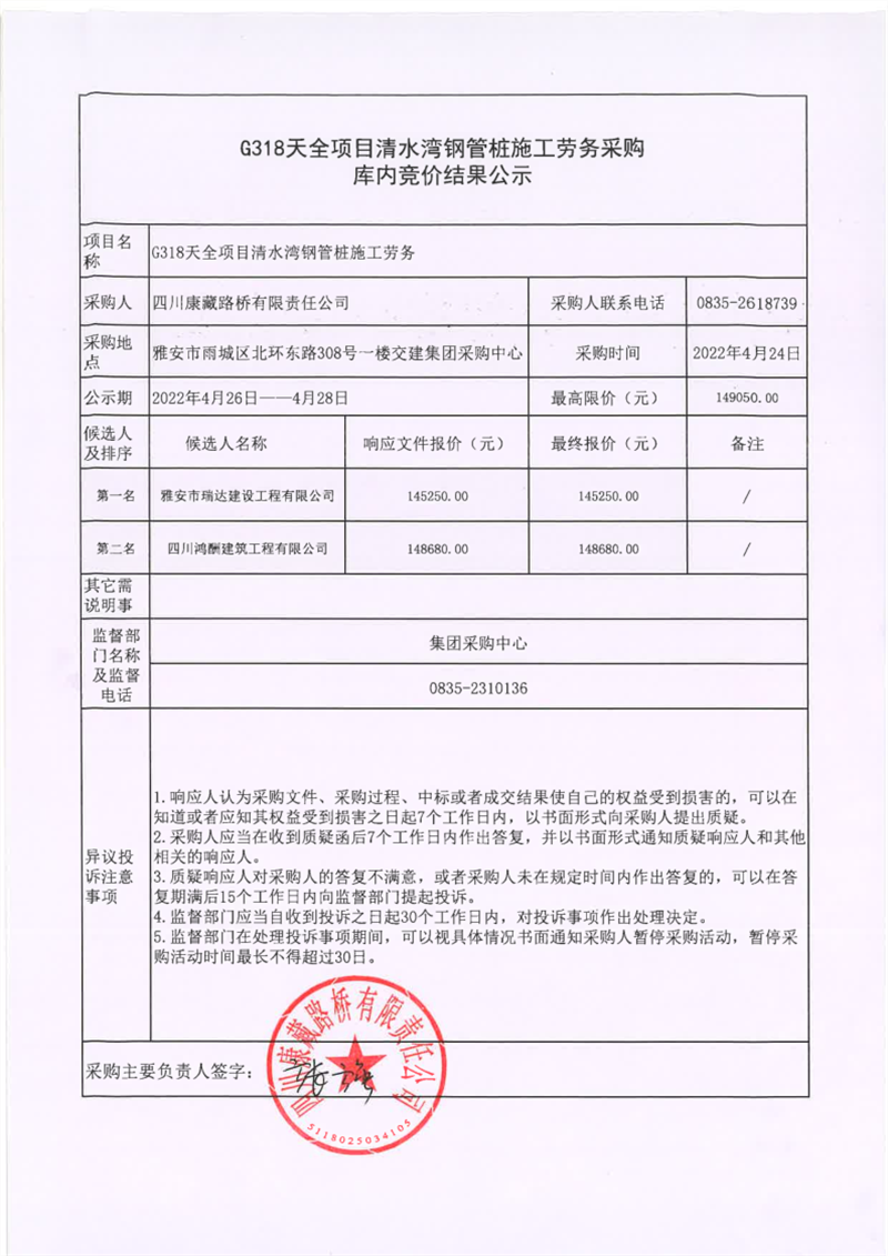 四川康藏路橋有限責(zé)任公司G318天全項目清水灣鋼管樁施工勞務(wù)采購庫內(nèi)競價結(jié)果公示