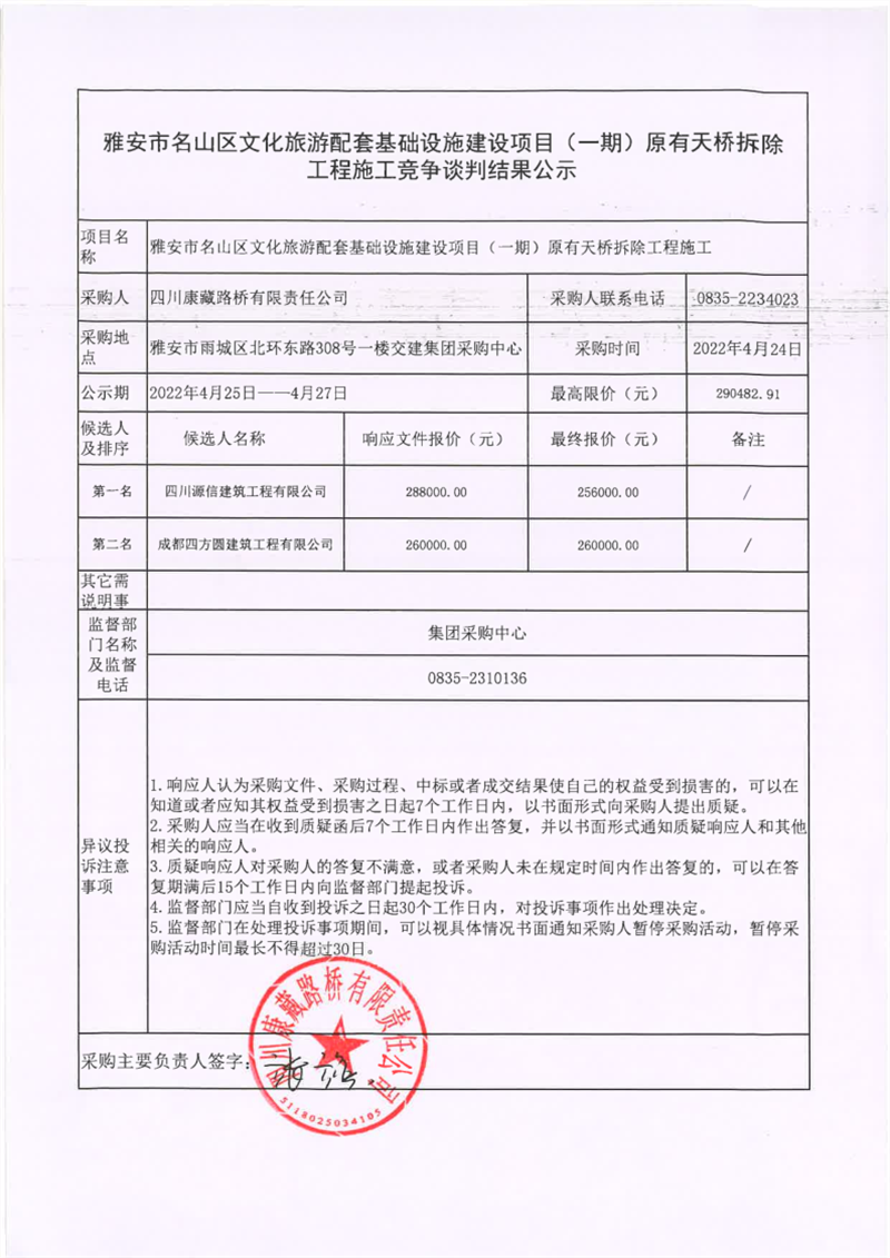 四川康藏路橋有限責(zé)任公司雅安市名山區(qū)文化旅游配套基礎(chǔ)設(shè)施建設(shè)項目(一期)原有天橋拆除工程施工競爭談判結(jié)果公示