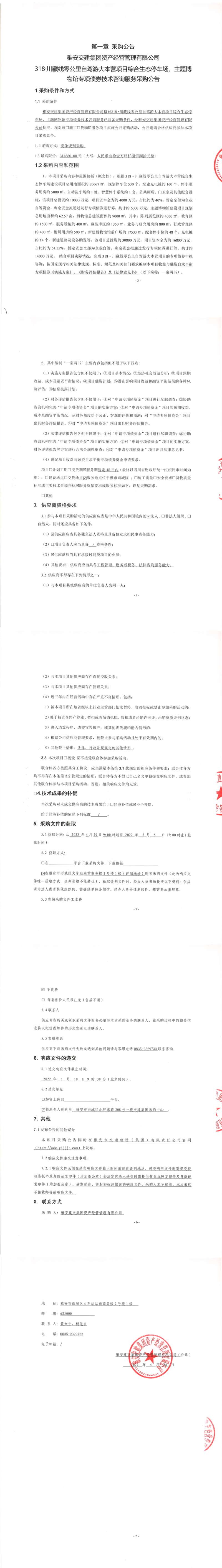 雅安交建集團(tuán)資產(chǎn)經(jīng)營(yíng)管理有限公司318.川藏線零公里自駕游大本營(yíng)項(xiàng)目綜合生態(tài)停車場(chǎng)、主題博物館專項(xiàng)債券技術(shù)咨詢服務(wù)采購公告