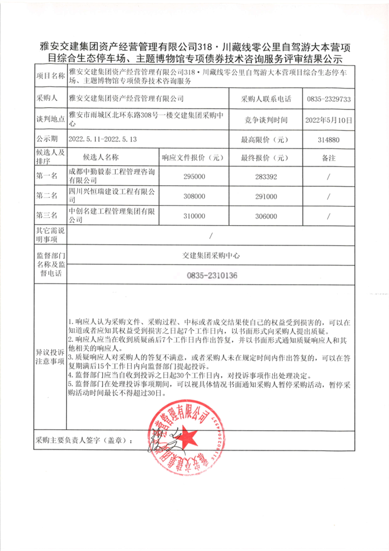 雅安交建集團(tuán)資產(chǎn)經(jīng)營管理有限公司318·川藏線零公里自駕游大本營項(xiàng)目綜合生態(tài)停車場、主題博物館專項(xiàng)債券技術(shù)咨詢服務(wù)評審結(jié)果公示
