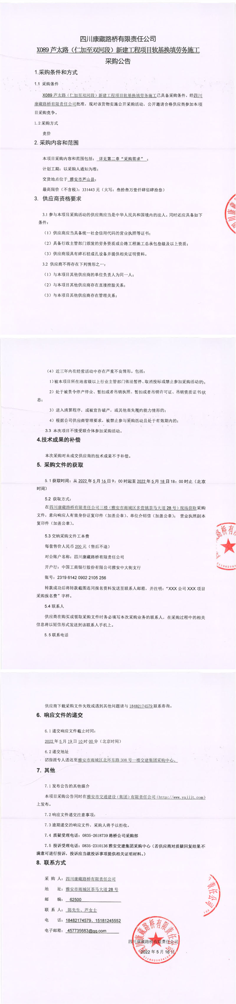 四川康藏路橋有限責任公司X089蘆太路(仁加至雙河段)新建工程項目軟基換填勞務施工采購公告