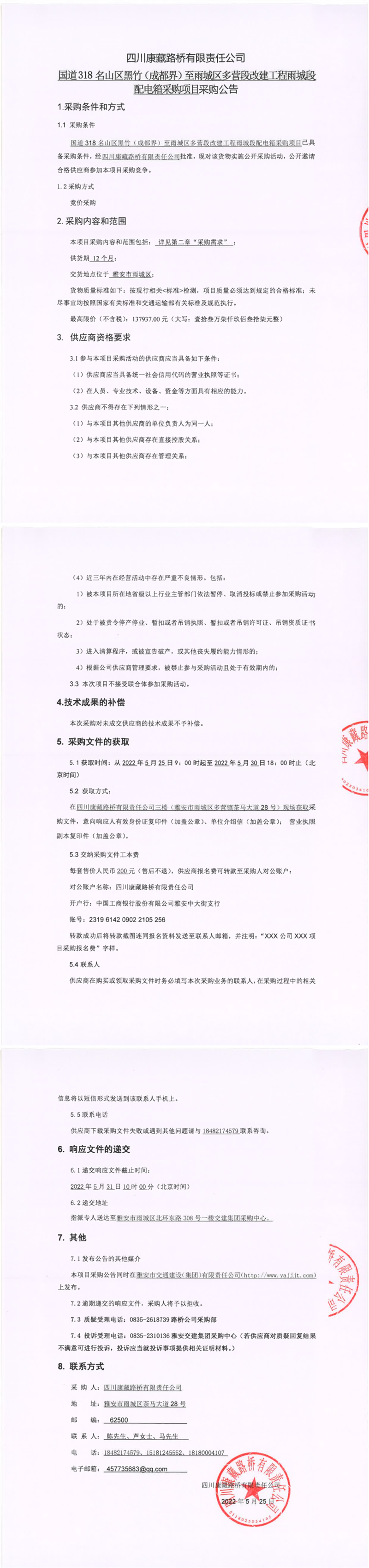 四川康藏路橋有限責任公司國道318名山區(qū)黑竹(成都界)至雨城區(qū)多營段改建工程雨城段配電箱采購項目采購公告