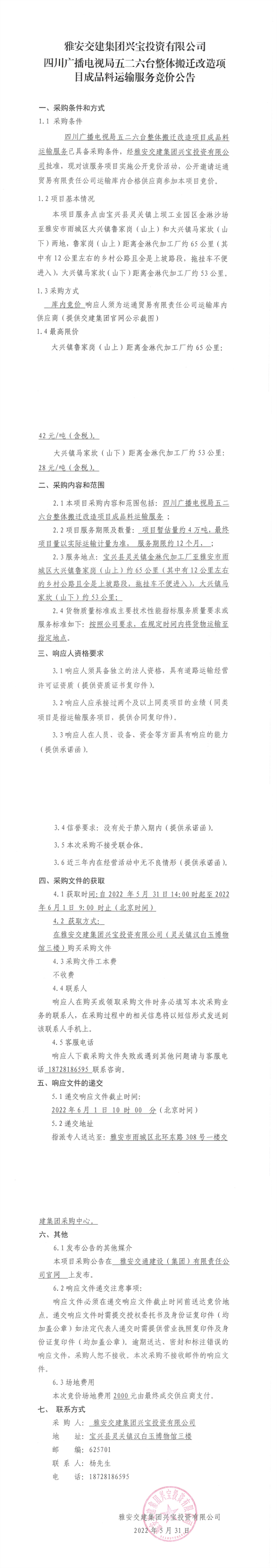 雅安交建集團興寶投資有限公司四川廣播電視局五二六臺整體搬遷改造項目成品料運輸服務競價公告