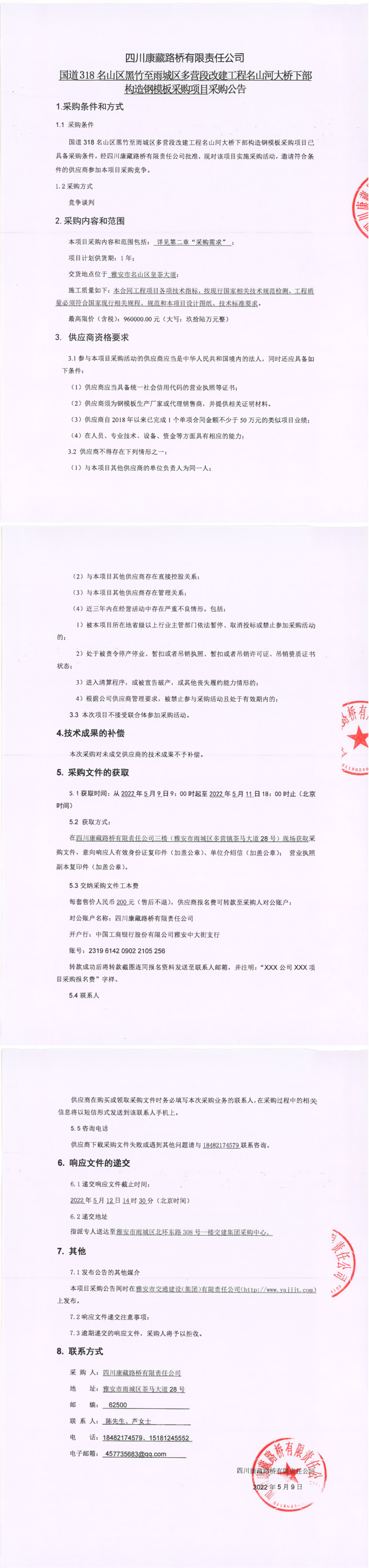 四川康藏路橋有限責任公司國道318名山區(qū)黑竹至雨城區(qū)多營段改建工程名山河大橋下部構造鋼模塊采購項目采購公告