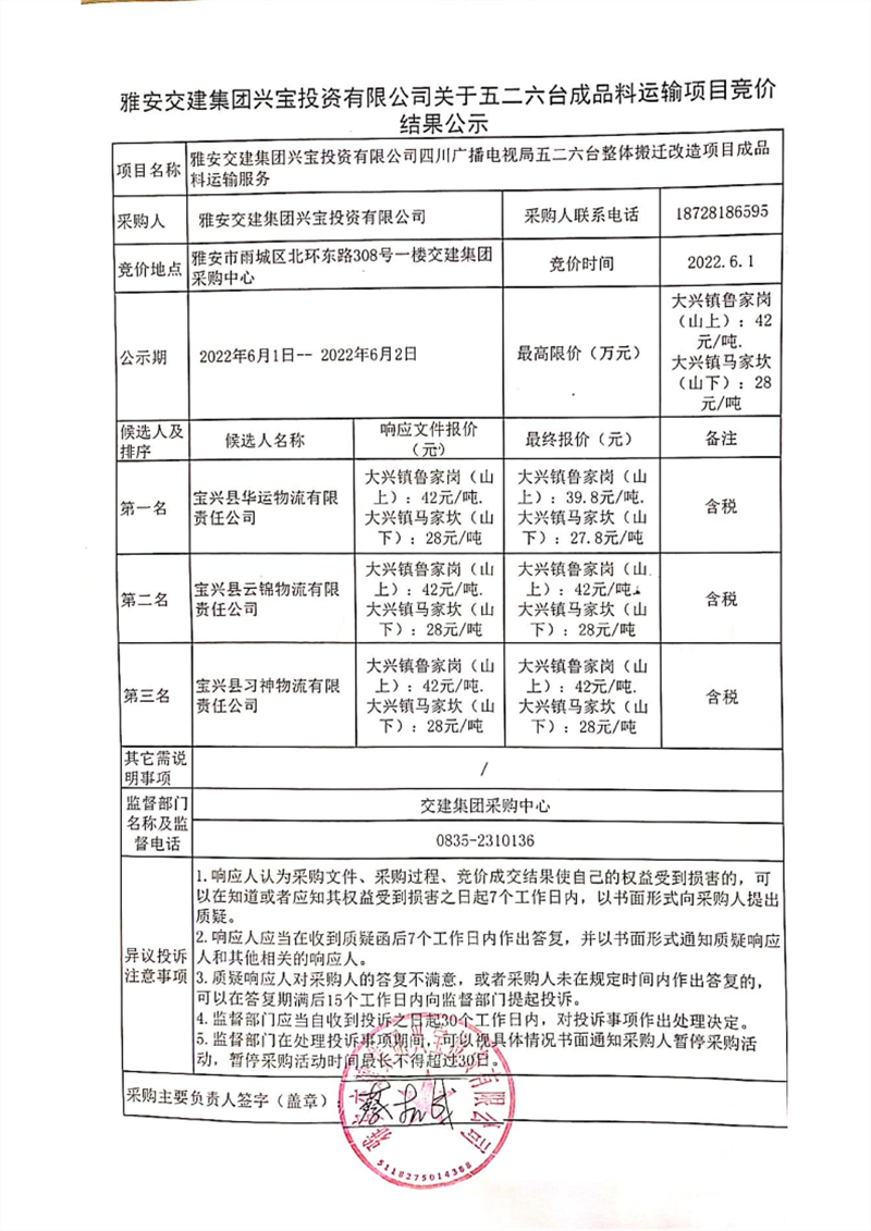 雅安交建集團興寶投資有限公司關(guān)于五二六臺成品料運輸項目競價結(jié)果公示