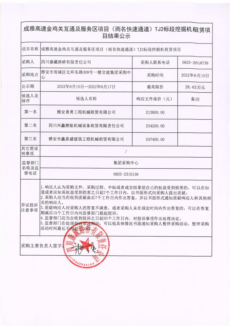 四川康藏路橋有限責(zé)任公司成雅高速金雞關(guān)互通及服務(wù)區(qū)項目(雨名快速通道)TJ2標段挖掘機租賃項目結(jié)果公示