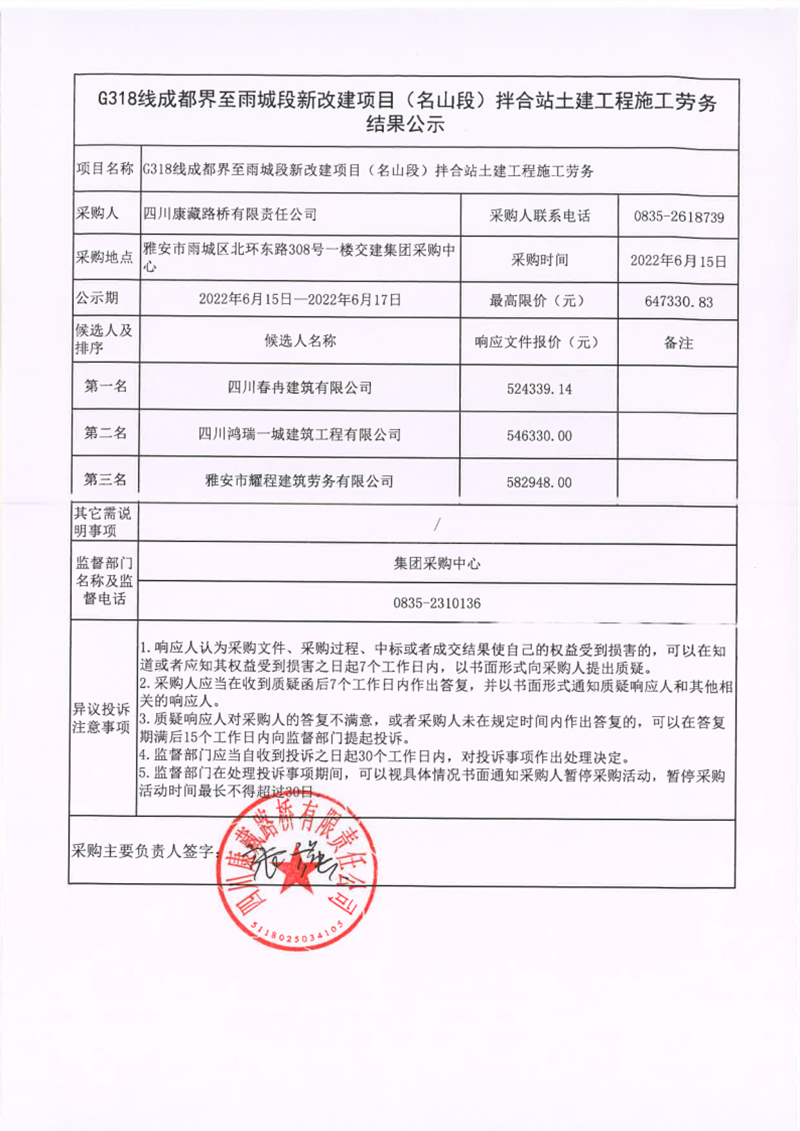 四川康藏路橋有限責(zé)任公司G318線成都界至雨城段新改建項目(名山段)拌合站土建工程施工勞務(wù)結(jié)果公示