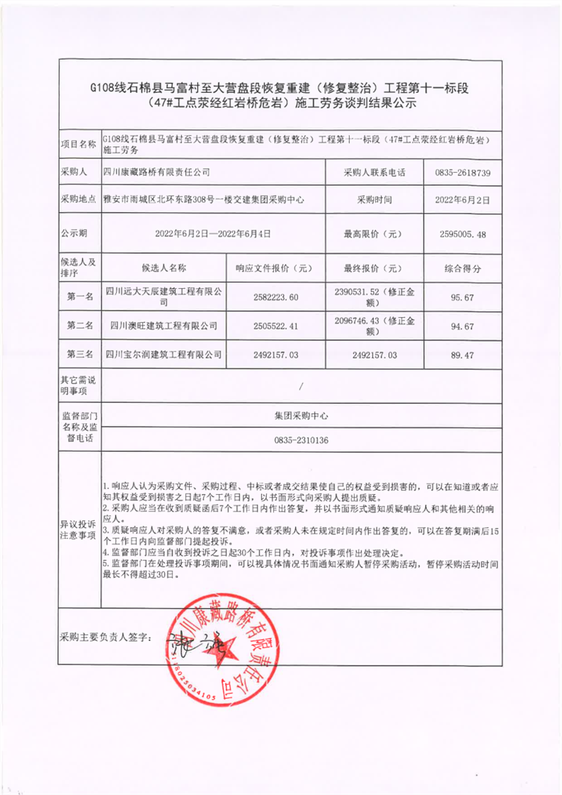 四川康藏路橋有限責(zé)任公司G108線石棉縣馬富村至大營盤段恢復(fù)重建(修復(fù)整治)工程第十一標(biāo)段(47#工點滎經(jīng)紅巖橋危巖)施工勞務(wù)談判結(jié)果公示