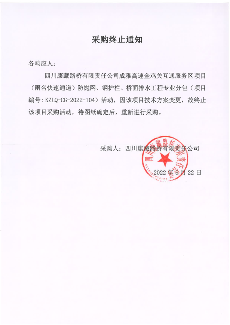 四川康藏路橋有限責(zé)任公司成雅高速金雞關(guān)互通服務(wù)區(qū)項目(雨名快速通道)防拋網(wǎng)、鋼護欄、橋面排水工程專業(yè)分包采購終止通知