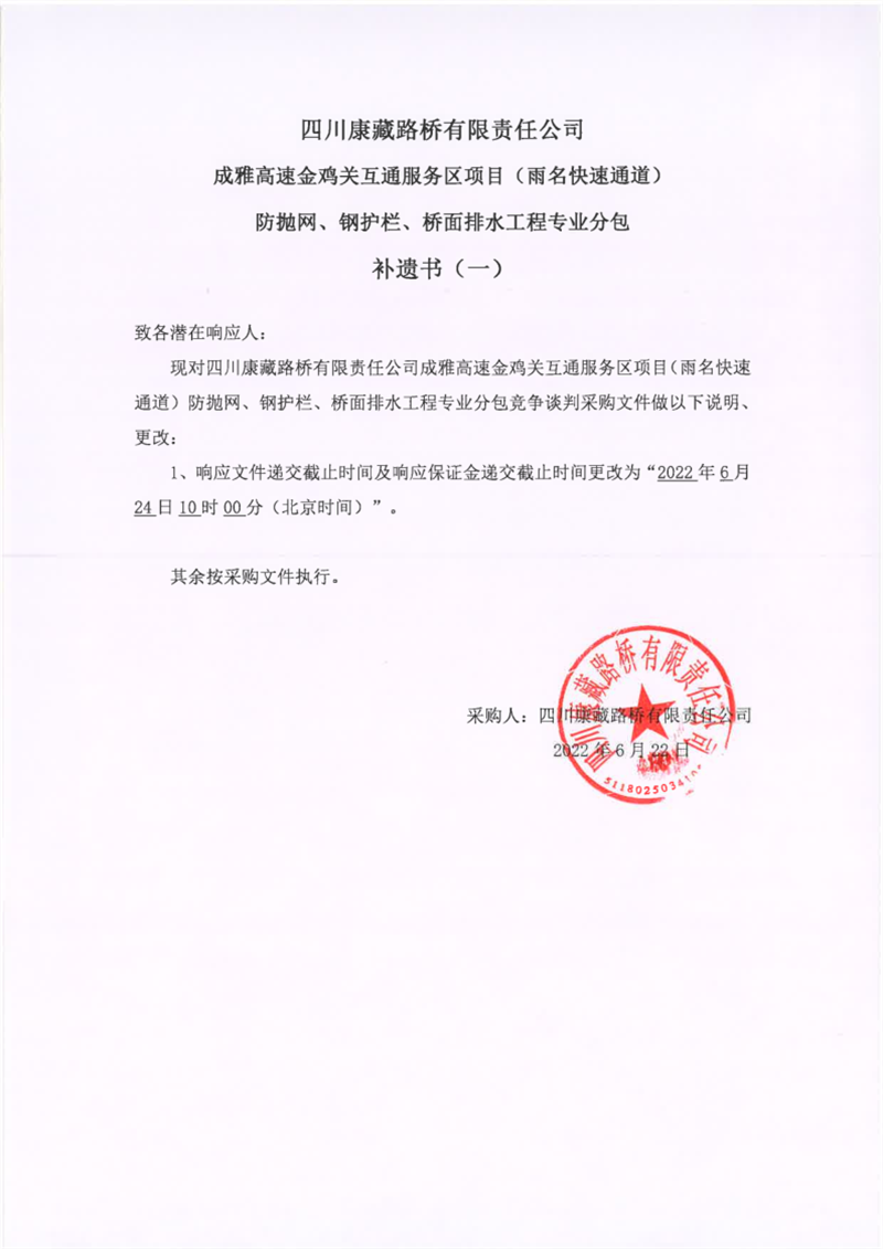 四川康藏路橋有限責任公司成雅高速金雞關互通服務區(qū)項目(雨名快速通道)防拋網、鋼護欄、橋面排水工程專業(yè)分包補遺書(一)