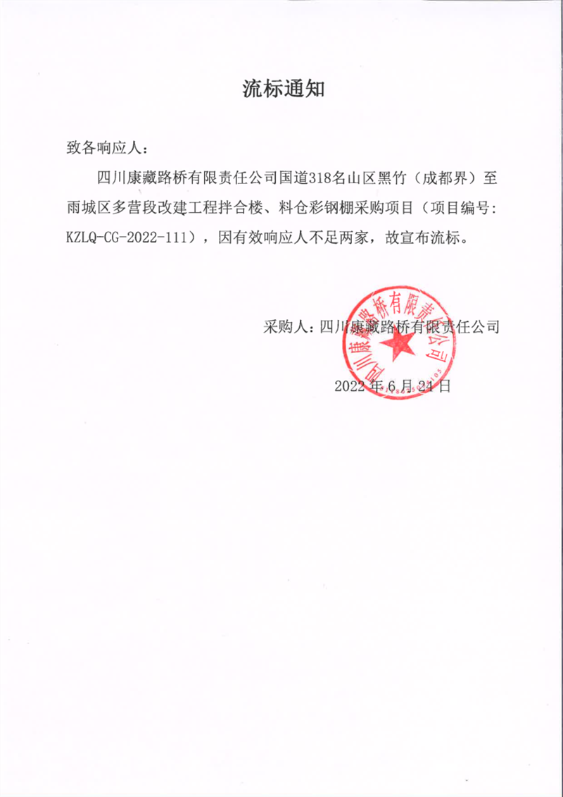 四川康藏路橋有限責任公司國道318名山區(qū)黑竹(成都界)至雨城區(qū)多營段改建工程拌合樓、料倉彩鋼棚采購項目流標通知