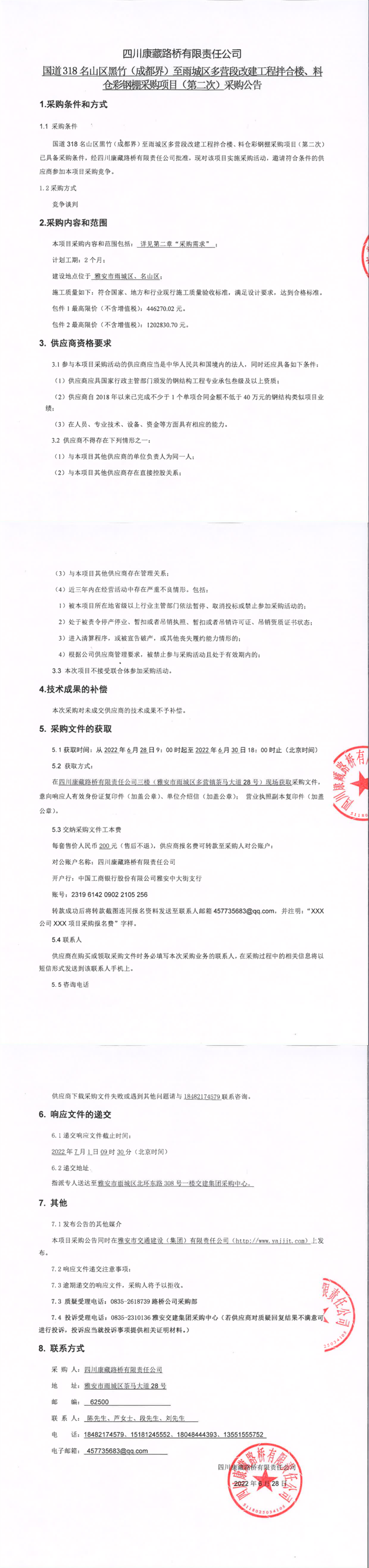 四川康藏路橋有限責(zé)任公司國道318名山區(qū)黑竹(成都界)至雨城區(qū)多營段改建工程拌合樓、料倉彩鋼棚采購項目(第二次)采購公告