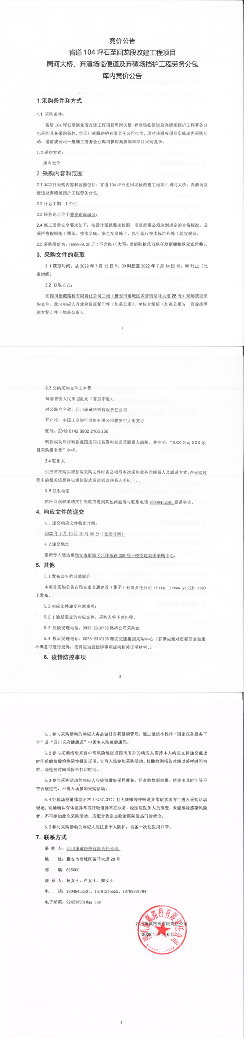 四川康藏路橋有限責(zé)任公司省道104坪石至回龍段改建工程項目周河大橋、棄渣場臨便道及棄碴場擋護工程勞務(wù)分包庫內(nèi)競價公告