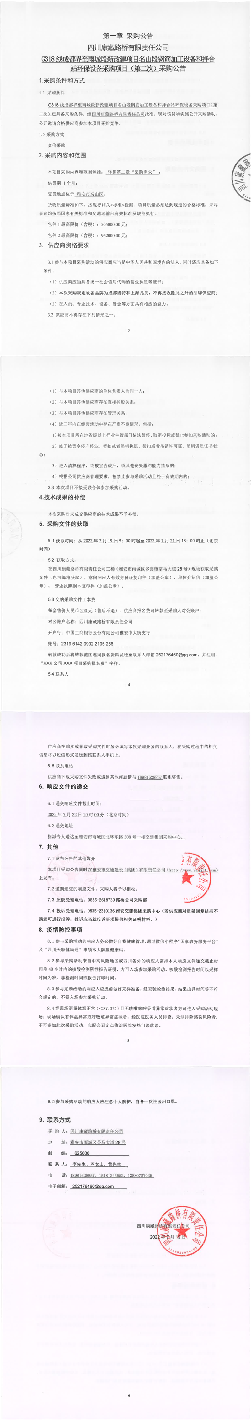 四川康藏路橋有限責(zé)任公司G318線成都界至雨城段新改建項(xiàng)目名山段鋼筋加工設(shè)備和拌合站環(huán)保設(shè)備采購(gòu)項(xiàng)目(第二次)采購(gòu)公告