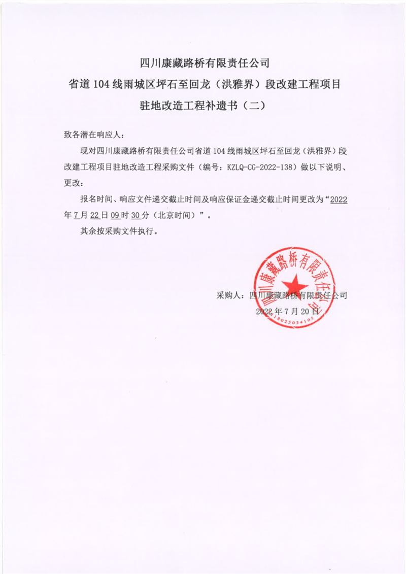 四川康藏路橋有限責(zé)任公司省道104線雨城區(qū)坪石至回龍(洪雅界)段改建工程項(xiàng)目駐地改造工程補(bǔ)遺書(二)