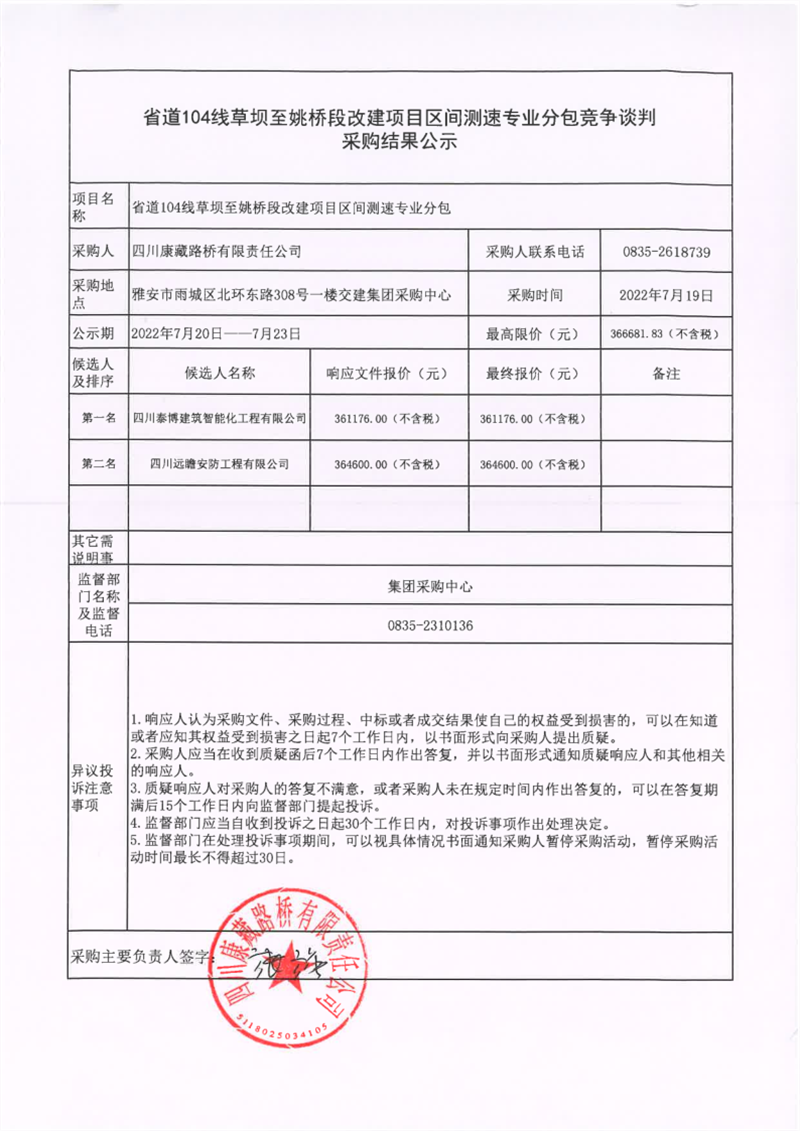 四川康藏路橋有限責(zé)任公司省道104線草壩至姚橋段改建項(xiàng)目區(qū)間測速專業(yè)分包競爭談判采購結(jié)果公示