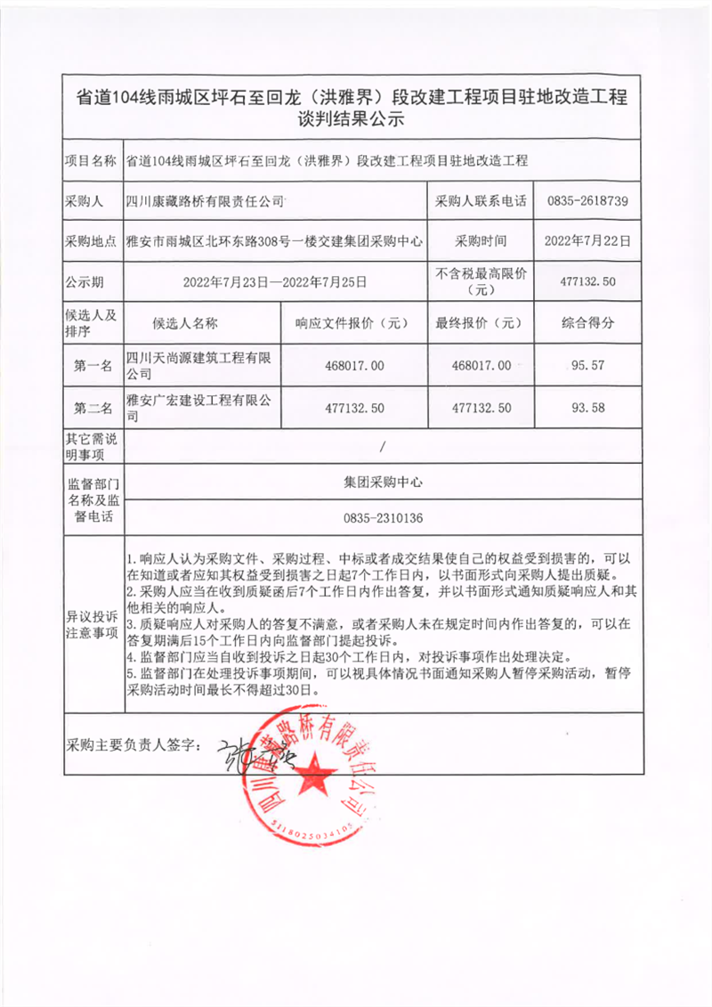 四川康藏路橋有限責(zé)任公司省道104線雨城區(qū)坪石至回龍(洪雅界)段改建工程項(xiàng)目駐地改造工程談判結(jié)果公示
