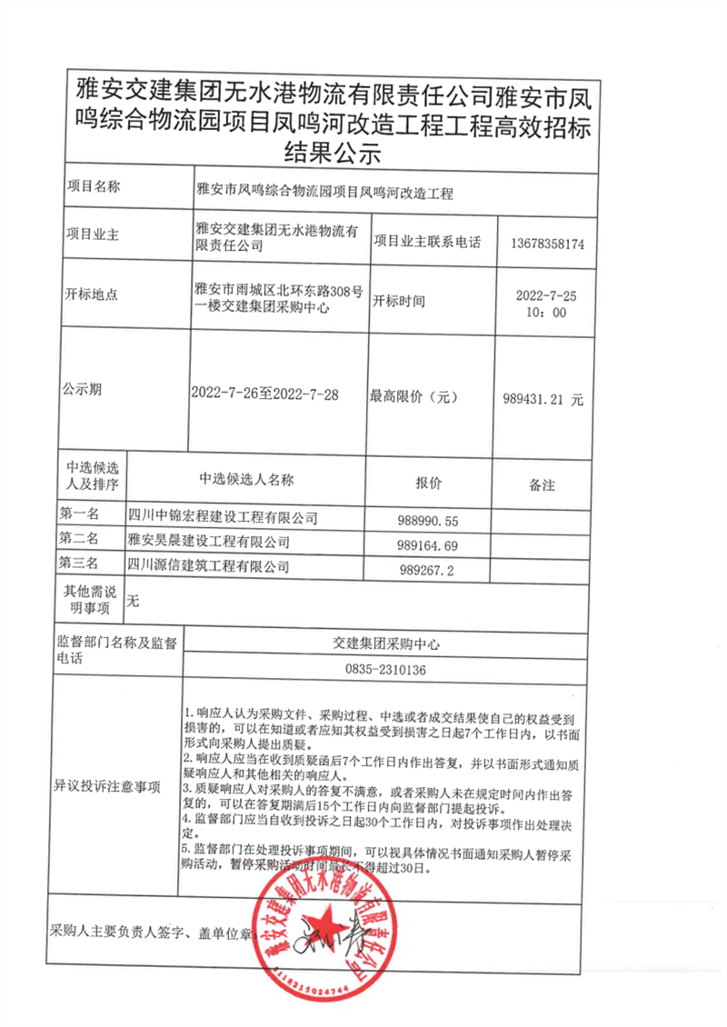 雅安交建集團無水港物流有限責任公司雅安市鳳鳴綜合物流園鳳鳴河改造工程工程高效招標結(jié)果公示
