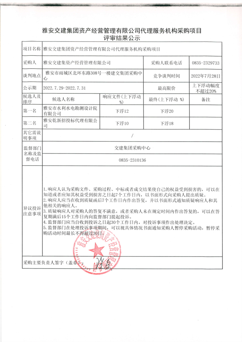 雅安交建集團資產(chǎn)經(jīng)營管理有限公司代理服務機構(gòu)采購項目評審結(jié)果公示