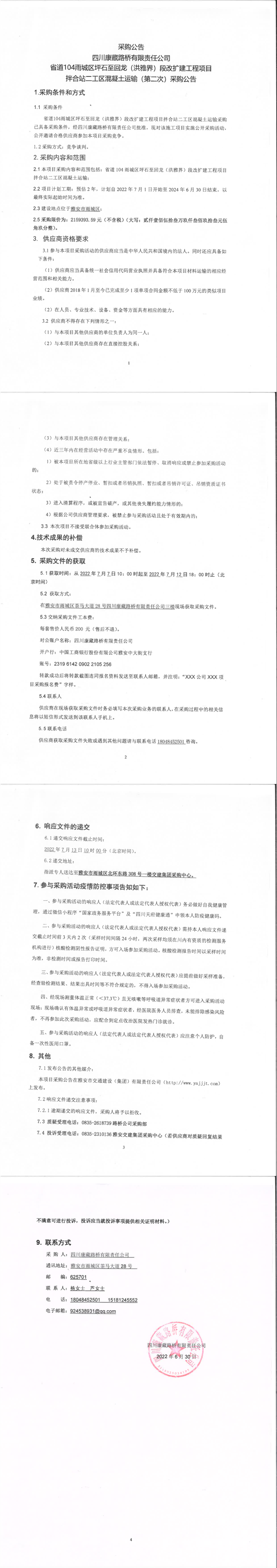 四川康藏路橋有限責(zé)任公司省道104雨城區(qū)坪石至回龍(洪雅界)段改建工程項(xiàng)目拌合站二工區(qū)混凝土運(yùn)輸(第二次)采購公告