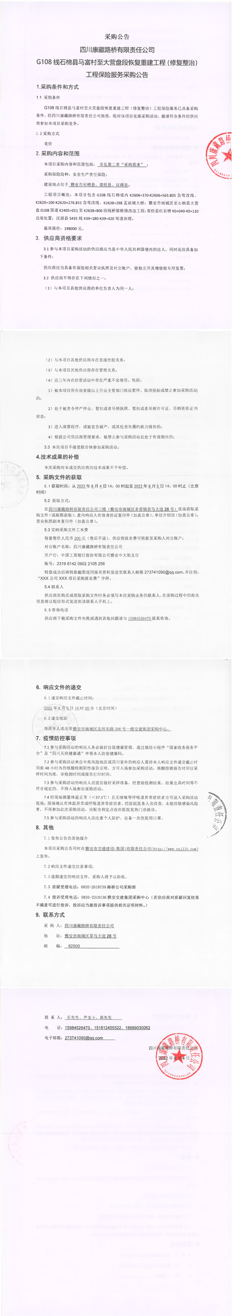 四川康藏路橋有限責任公司G108線石棉縣馬富村至大營盤段恢復重建工程(修復整治)工程保險服務采購公告