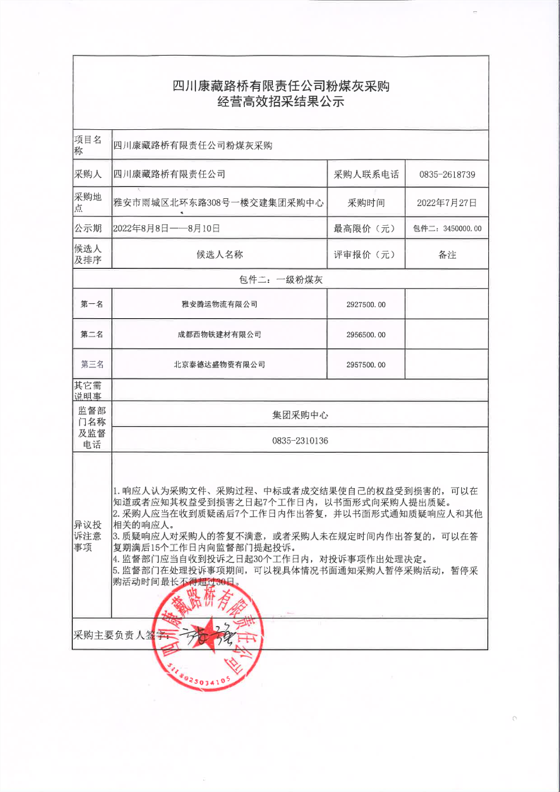 四川康藏路橋有限責任公司粉煤灰采購經營高效招采結果公示