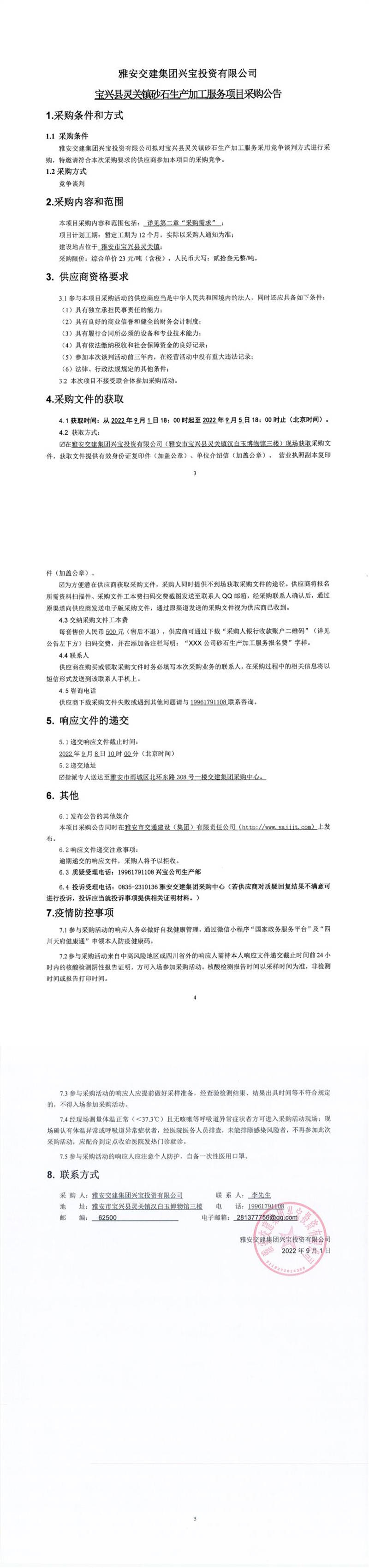 雅安交建集團興寶投資有限公司寶興縣靈關(guān)鎮(zhèn)砂石生產(chǎn)加工服務項目采購公告