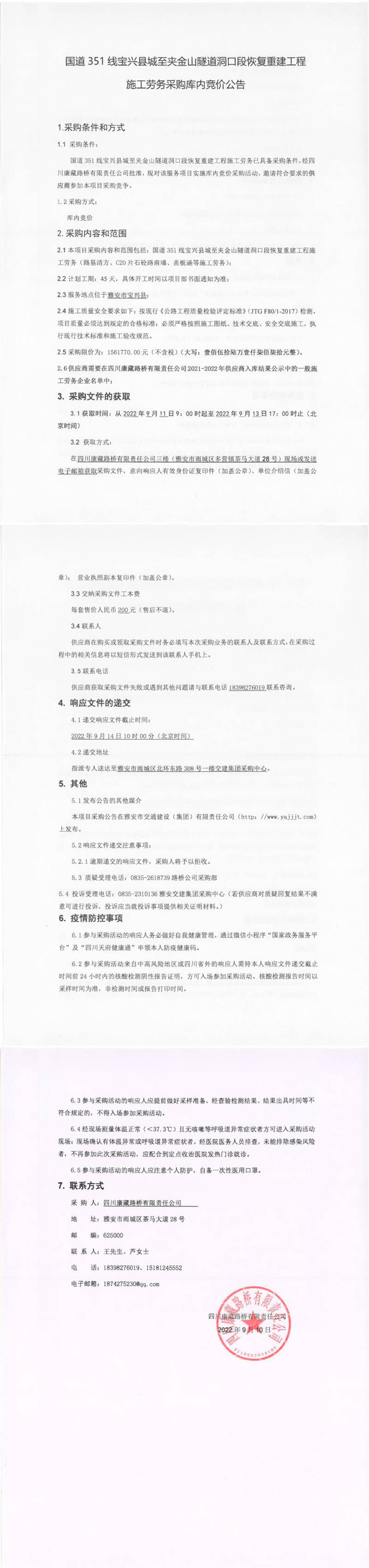 四川康藏路橋有限責任公司國道351線寶興縣城至夾金山隧道洞口段恢復(fù)重建工程施工勞務(wù)采購庫內(nèi)競價公告