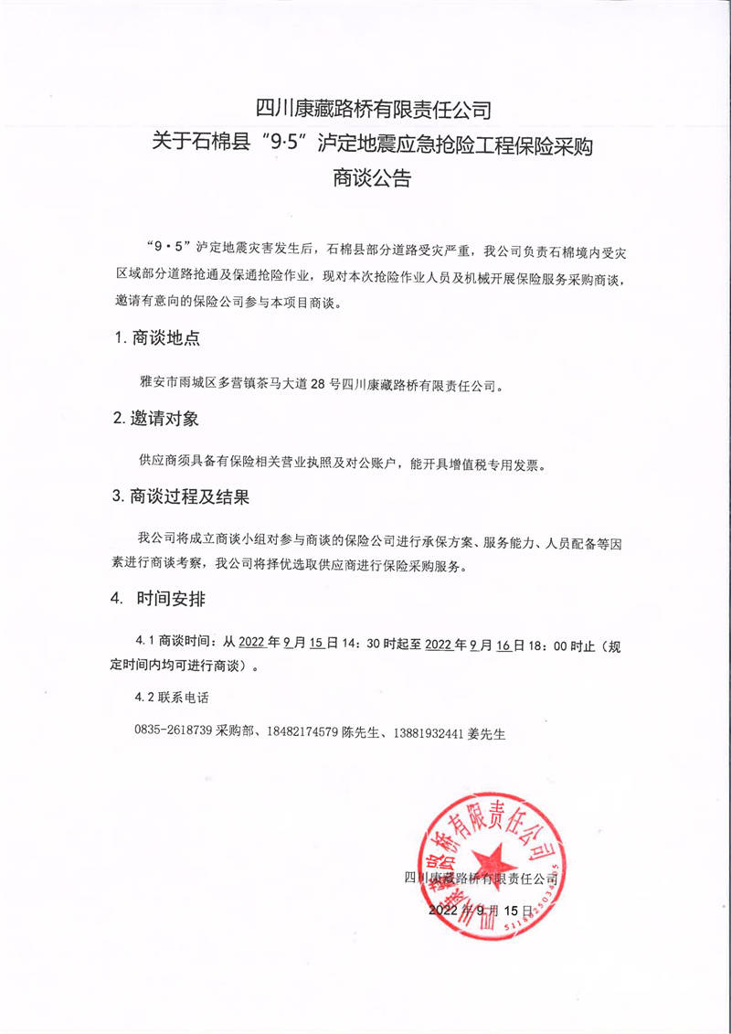 四川康藏路橋有限責(zé)任公司關(guān)于石棉縣“9·5”瀘定地震應(yīng)急搶險工程保險采購商談公告