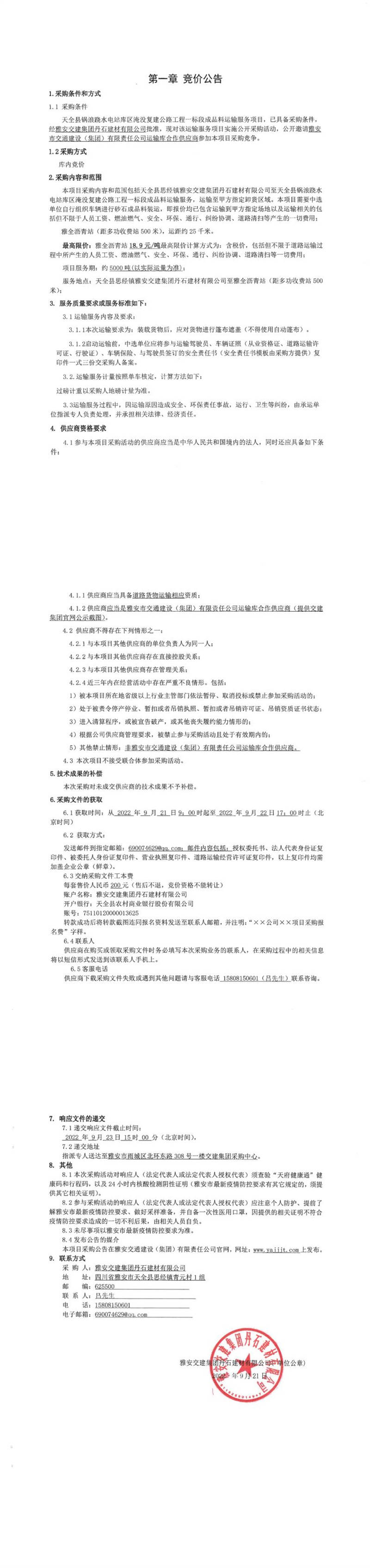 雅安交建集團(tuán)丹石建材有限公司天全縣鍋浪蹺水電站庫(kù)區(qū)淹沒(méi)復(fù)建公路工程一標(biāo)段成品料運(yùn)輸服務(wù)項(xiàng)目競(jìng)價(jià)公告