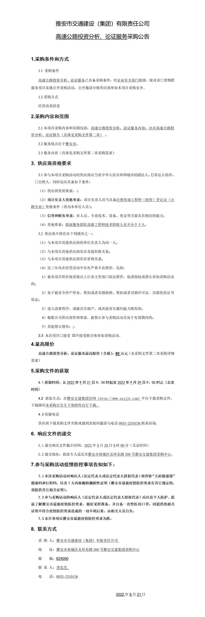 雅安市交通建設(shè)(集團(tuán))有限責(zé)任公司高速公路投資分析、論證服務(wù)采購(gòu)公告