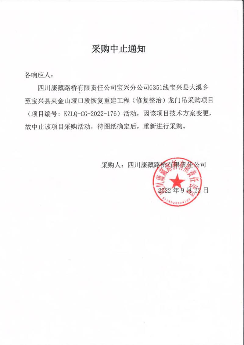 四川康藏路橋有限責(zé)任公司寶興分公司G351線寶興縣大溪鄉(xiāng)至寶興縣夾金山埡口段恢復(fù)重建工程(修復(fù)整治)龍門吊采購(gòu)中止通知