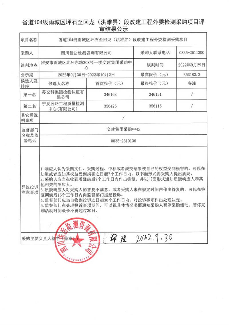四川佳岳檢測(cè)咨詢有限公司省道104線雨城區(qū)坪石至回龍(洪雅界)段改建工程外委檢測(cè)采購(gòu)項(xiàng)目評(píng)審結(jié)果公示