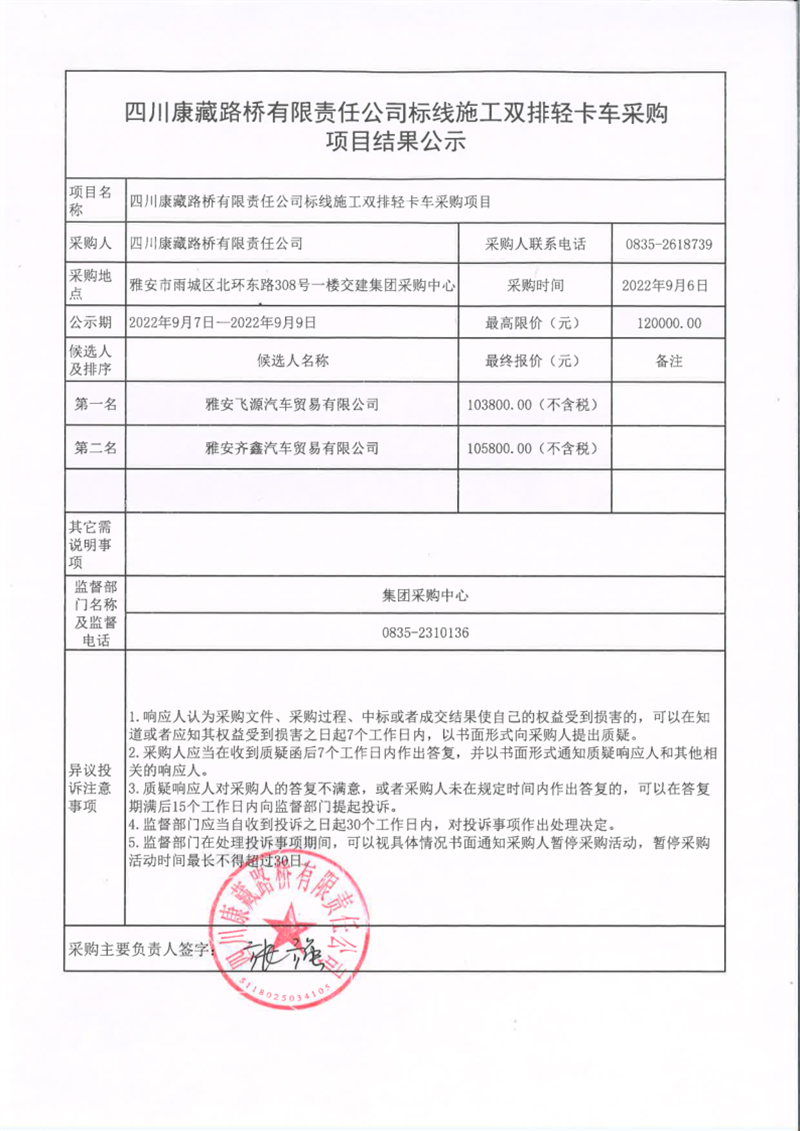四川康藏路橋有限責(zé)任公司標(biāo)線施工雙排輕卡車采購項(xiàng)目結(jié)果公示