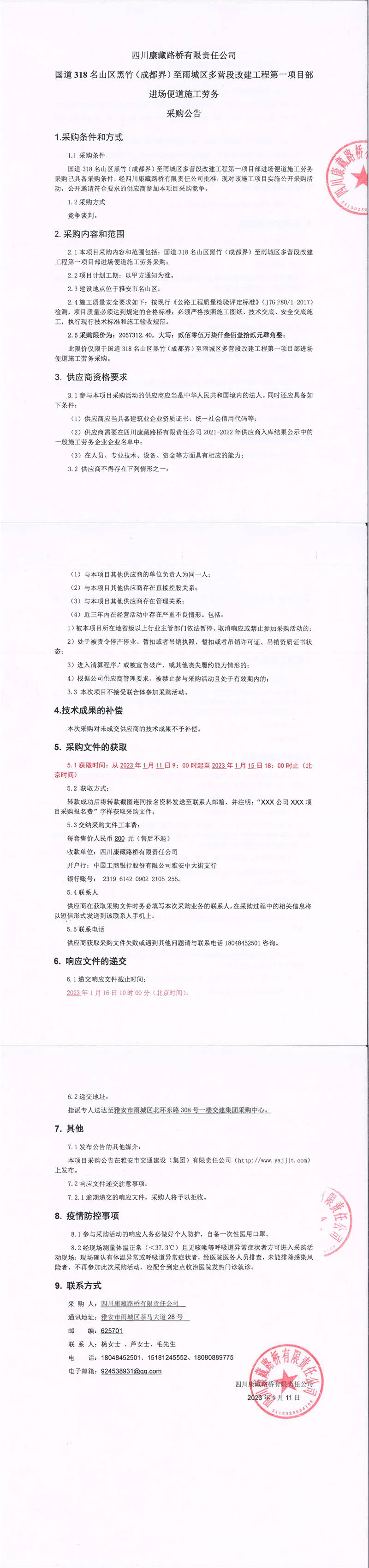 四川康藏路橋有限責(zé)任公司國道318名山區(qū)黑竹(成都界)至雨城區(qū)多營段改建工程第一項(xiàng)目部進(jìn)場(chǎng)便道施工勞務(wù)采購公告