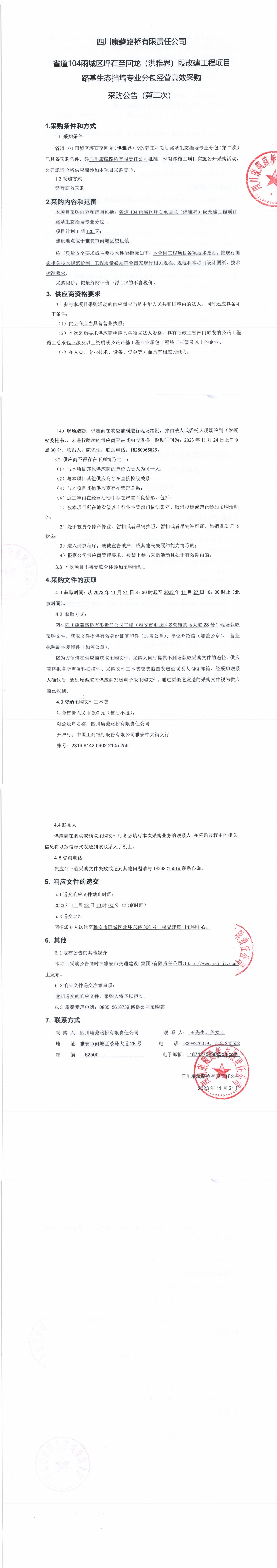 四川康藏路橋有限責(zé)任公司省道104雨城區(qū)坪石至回龍(洪雅界)段改建工程項(xiàng)目路基生態(tài)擋墻專業(yè)分包經(jīng)營高效采購(第二次)采購公告