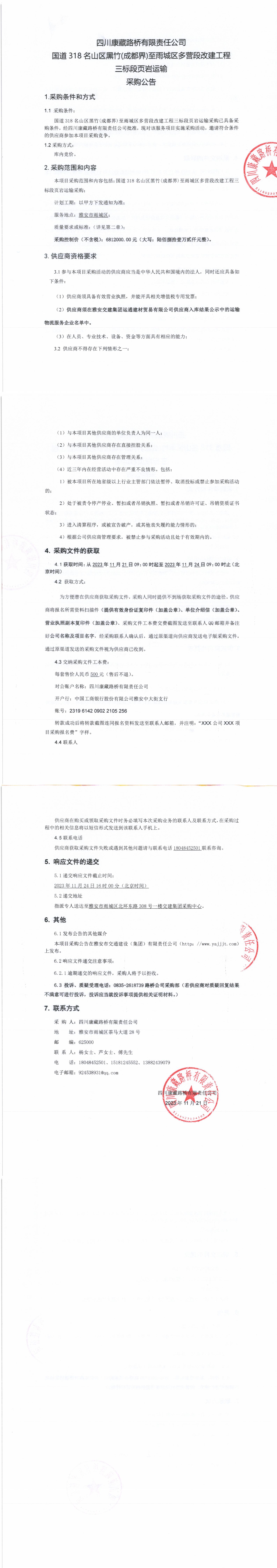 四川康藏路橋有限責任公司國道318名山區(qū)黑竹(成都界)至雨城區(qū)多營段改建工程三標段頁巖運輸采購公告