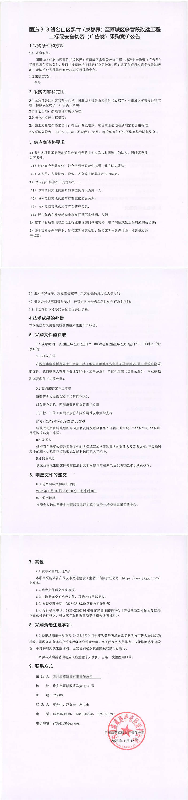 四川康藏路橋有限責(zé)任公司國道318線名山區(qū)黑竹(成都界)至雨城區(qū)多營段改建工程二標段安全物資(廣告類)采購競價公告