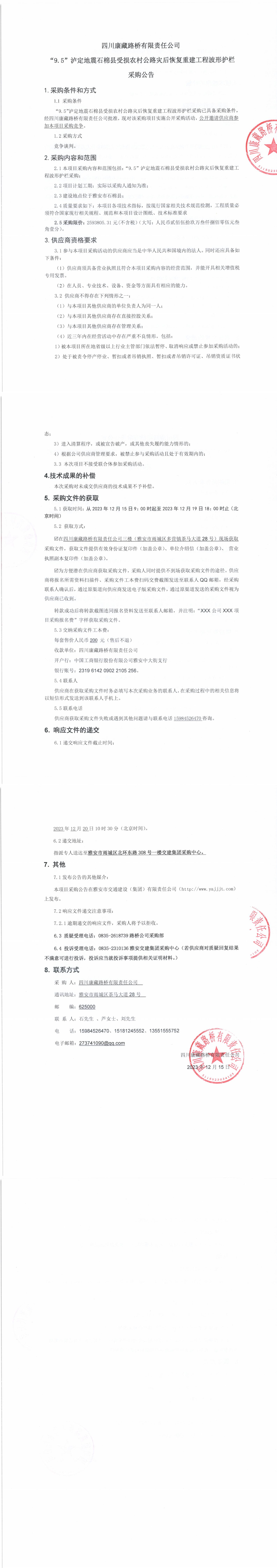 四川康藏路橋有限責(zé)任公司“9.5”瀘定地震石棉縣受損農(nóng)村公路災(zāi)后恢復(fù)重建工程波形護(hù)欄采購公告